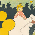 Additional Details: Original exhibition poster featuring the work of Henri de Toulouse-Lautrec, created for the Louisiana Museum in Humlebæk, Denmark. Printed in Paris by Mourlot, the poster captures one of Lautrec’s most iconic subjects—the bustling nightlife of the Moulin Rouge. In the composition, a patron is shown standing at a short distance from the stage, observing as a dancer performs the famous French cancan, her dress lifted in a flurry of motion as she kicks her legs high. The scene brims with the energy, movement, and atmosphere that defined Lautrec’s vision of Parisian cabaret culture, blending sharp observation with expressive design. This example stands as both an homage to Lautrec’s original lithographic practice and a collectible piece of museum ephemera.