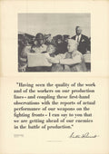 Additional Details: This striking 1942 lithograph poster, printed by the U.S. Government Printing Office, captures a pivotal moment in American history. The poster depicts President Franklin D. Roosevelt seated, delivering one of his most critical wartime speeches. In this black-and-white image, Roosevelt is addressing the nation concerning the performance of wartime weapon production, emphasizing the need for unity and effort on the home front to secure victory in World War II. The image of Roosevelt is skillfully rendered in lithographic detail, conveying the seriousness and resolve of his leadership during this challenging period. The accompanying text, also produced in lithograph, is from a speech in which Roosevelt speaks of the United States' advancing position in the "battle of production." He concludes with the inspiring message: "I can say to you that we are getting ahead of our enemies in the battle of production." The poster is signed in the plate, further adding to its historical significance. Produced by the War Production Board as part of a national effort to rally citizens to contribute to the war effort, the poster is not only a call to action but also a testament to the vital role of industry and production in the Allied victory. For collectors of wartime memorabilia or those with an interest in World War II history, this poster is an extraordinary artifact. It serves as a reminder of the immense industrial efforts on the home front and the leadership of Franklin D. Roosevelt during one of the most defining moments in American history.
