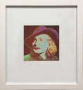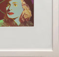 Additional Details: Ingrid Bergman from “Casablanca” (1983) by Andy Warhol, published by Galerie Börjeson in Malmö, Sweden, features Bergman with a mint-blue face, plum hat, and golden hair—an unforgettable fusion of elegance and Pop vibrancy. Warhol elevates her from screen legend to contemporary icon through his signature color contrasts and minimalist power. Printed on glossy paper and bearing Warhol’s printed signature, this authorized edition captures his late-career brilliance. Framed in white wood with a 4-inch mat and UV-plexi, this portrait celebrates Warhol’s enduring dialogue between cinema, fame, and art.