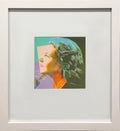 Additional Details: Ingrid Bergman (Profile), 1983, published by Galerie Börjeson in Malmö, Sweden, transforms a classic 1940s studio portrait of Bergman into a Pop Art meditation on beauty and introspection. Warhol’s cool palette of teal, lavender, and soft green gives the image both serenity and depth, highlighting his ability to merge glamour with emotional restraint. Printed under Warhol’s supervision and bearing his printed signature, this work offers a rare glimpse into his late portraiture. Framed in white wood with a 4-inch mat and UV-plexi, the piece captures Warhol’s refined exploration of fame, identity, and timeless allure.