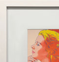 Additional Details: Ingrid Bergman (Profile), 1983, published by Galerie Börjeson, glows with rich orange and gold tones against soft blue highlights. Warhol transforms Bergman’s 1940s studio portrait into a radiant Pop vision that balances elegance and modernity. Bearing Warhol’s printed signature, this rare authorized edition embodies his fascination with celebrity and color variation. Framed in white wood with a 4-inch mat and UV-plexi, the artwork presents with refined clarity and cinematic warmth.