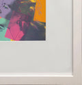 Additional Details: Ingrid Bergman (Profile), 1983, published by Galerie Börjeson, features vibrant overlays of pink, yellow, violet, and teal that transform Bergman’s classic profile into a striking study of color and perception. Bearing Warhol’s printed signature, this rare authorized edition reflects his late-career exploration of fame and abstraction. Framed in white wood with a 4-inch mat and UV-plexi, the artwork’s layered hues and geometric composition capture Warhol’s sophisticated Pop sensibility.
