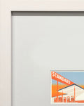 Additional Details: Offset Lithograph from a portfolio of six prints published by the Museum of Modern Art, but now out of print. Ed Ruscha’s Standard Station is among his most iconic images, encapsulating his fascination with the American landscape, consumer culture, and roadside architecture. First created in the 1960s, the bold perspective and dynamic typography evoke both the promise and the impersonality of the modern highway. This edition, part of a MoMA six-print portfolio, has long been out of print, making it highly collectible for admirers of Pop and Conceptual art. Presented in a white wood frame with a 1-inch front profile and a 3/4-inch side profile, the artwork is mounted behind a 4-inch mat, offering a clean, gallery-quality display that enhances the strength of Ruscha’s composition.